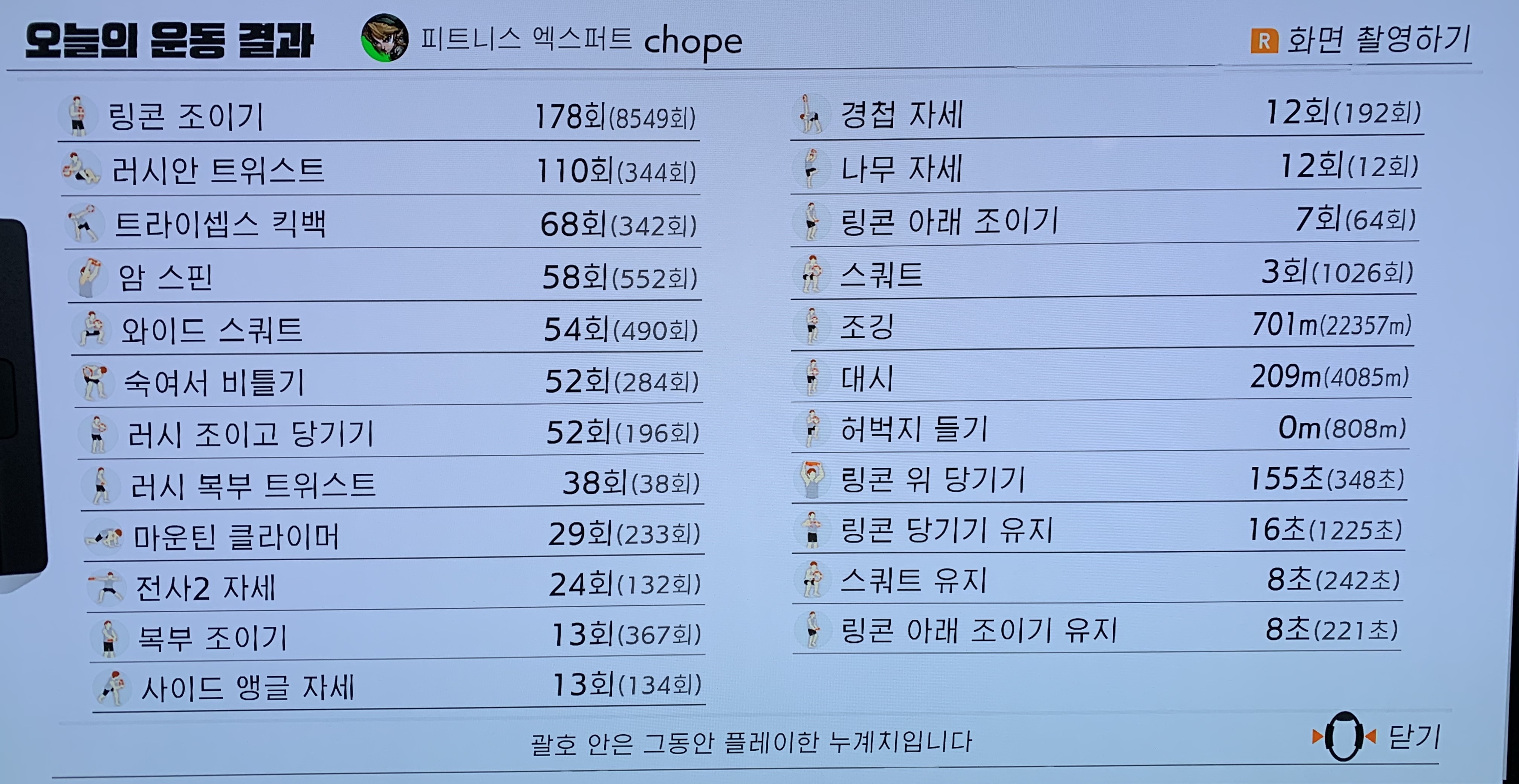 링피트에서 나오는 총 활동 시간은 실제 몸을 움직여 운동한 시간이라 실제 시간보다 너무 적게 나온다..