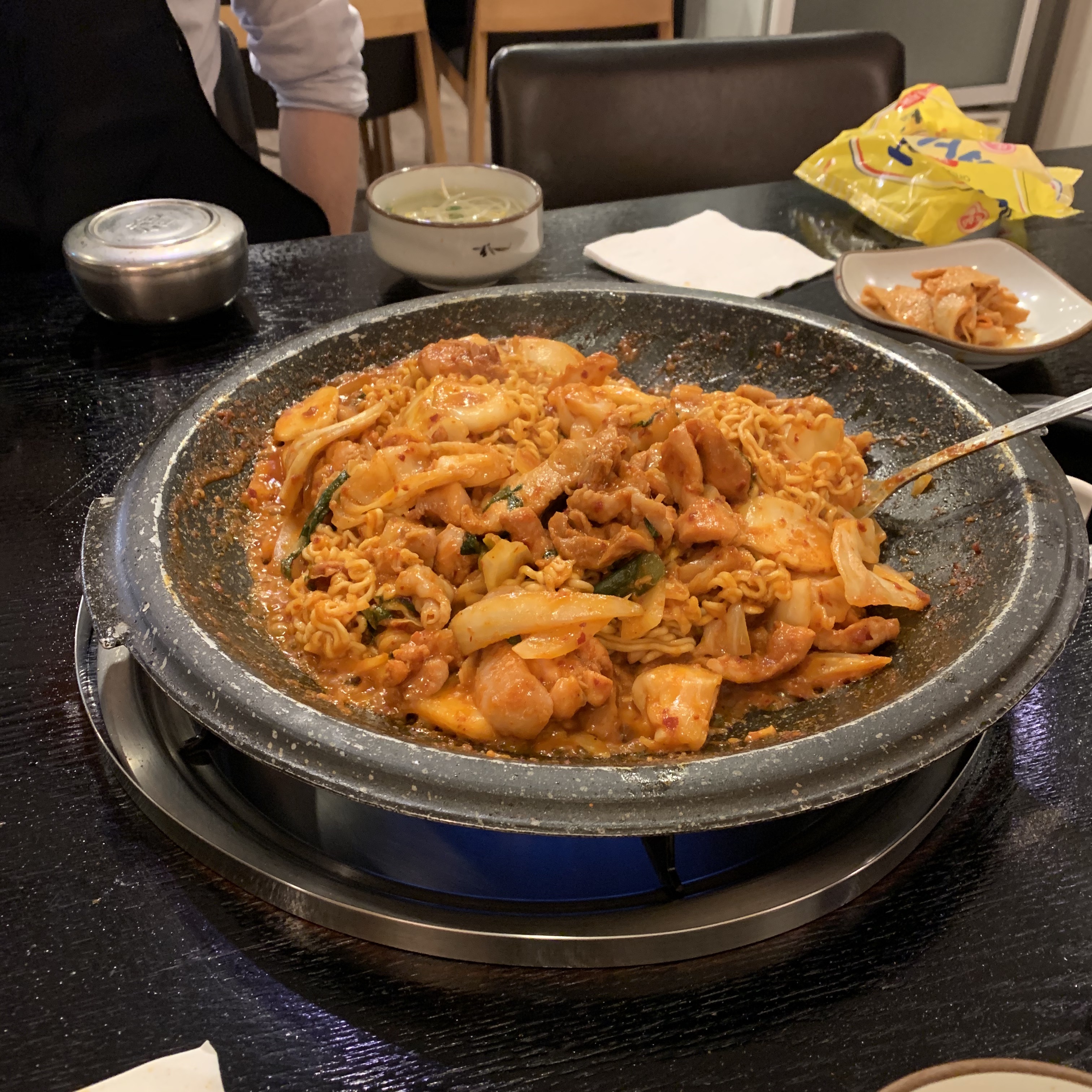 닭갈비에 라면 사리를 넣어 보는 새로운 시도를 했다.