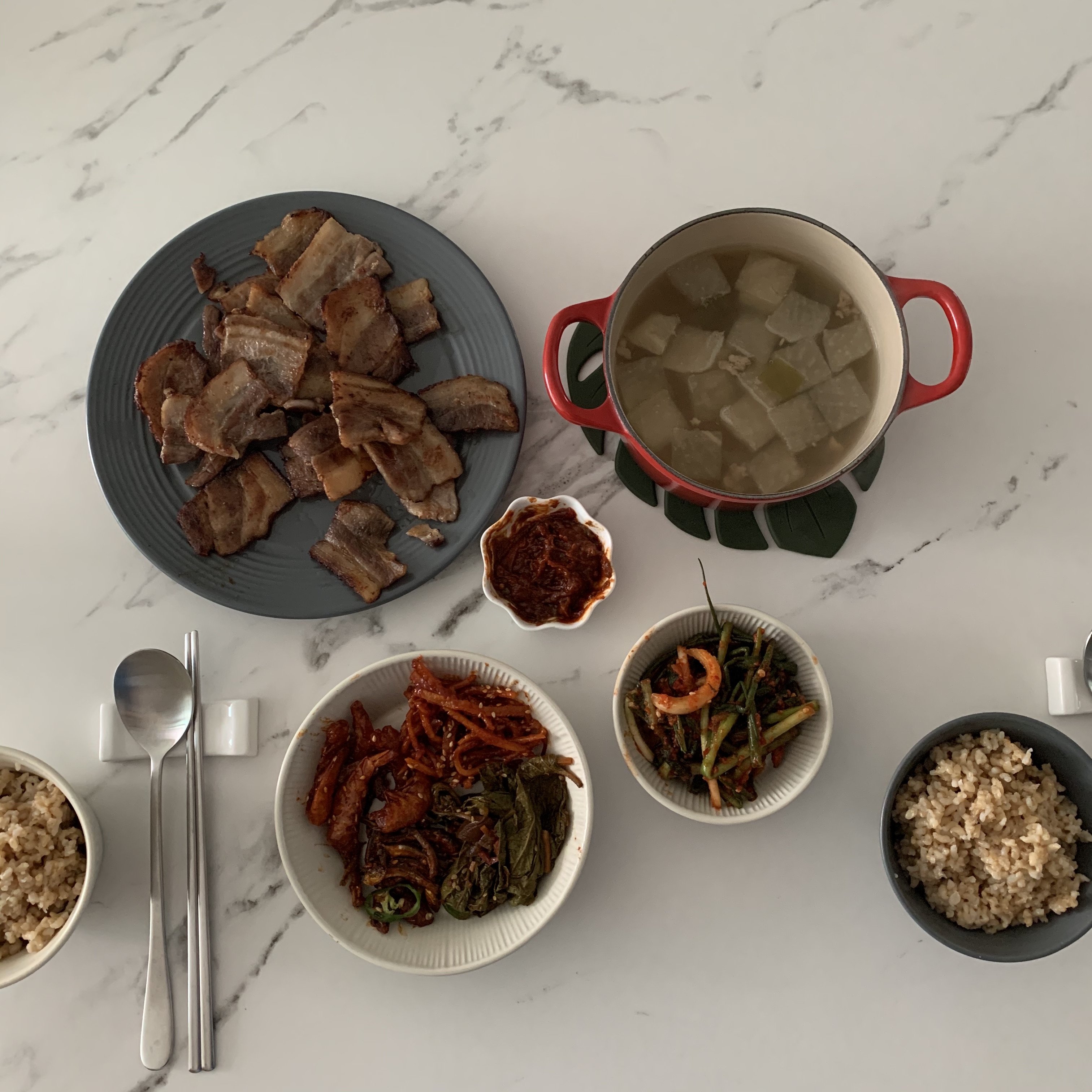 삼겹살, 소고기 무국, 파김치 등