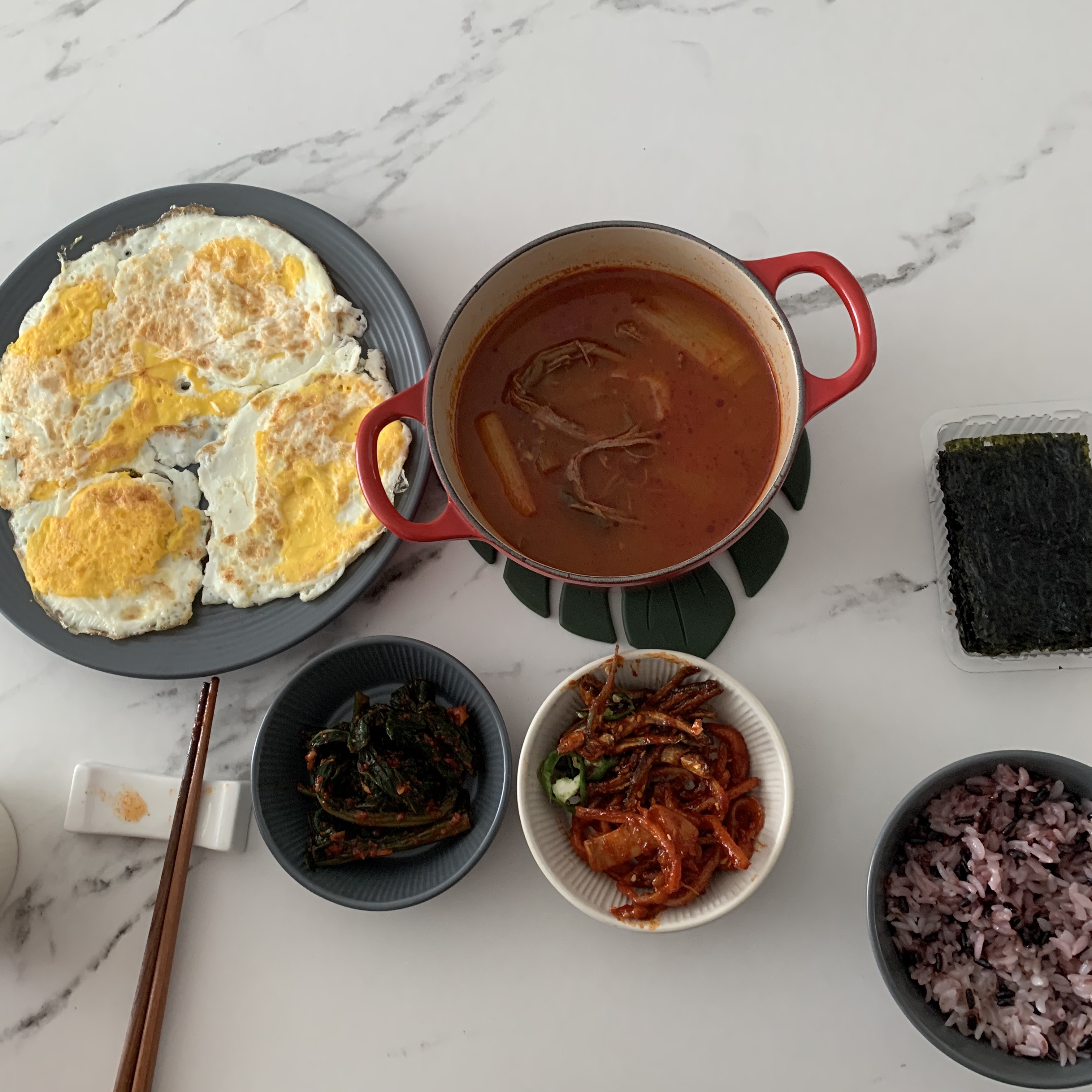 점심은 계란 프라이, 육개장, 김, 반찬들
