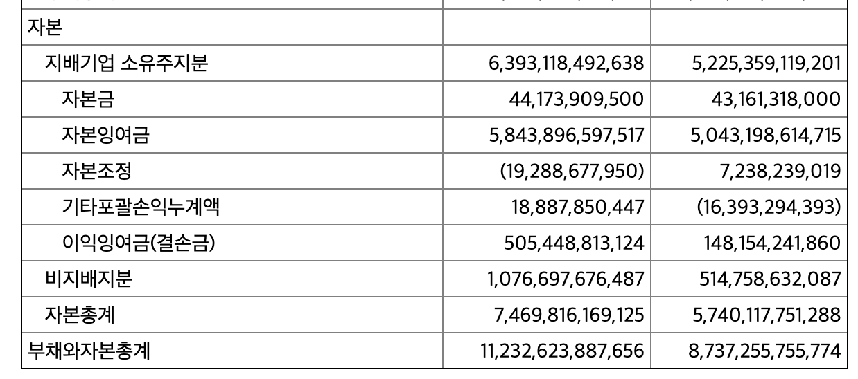 참고로 자본총계(순자산)을 지배/비지배로 나눠서 보는 것은 IFRS 와 관련이 있다고 한다.